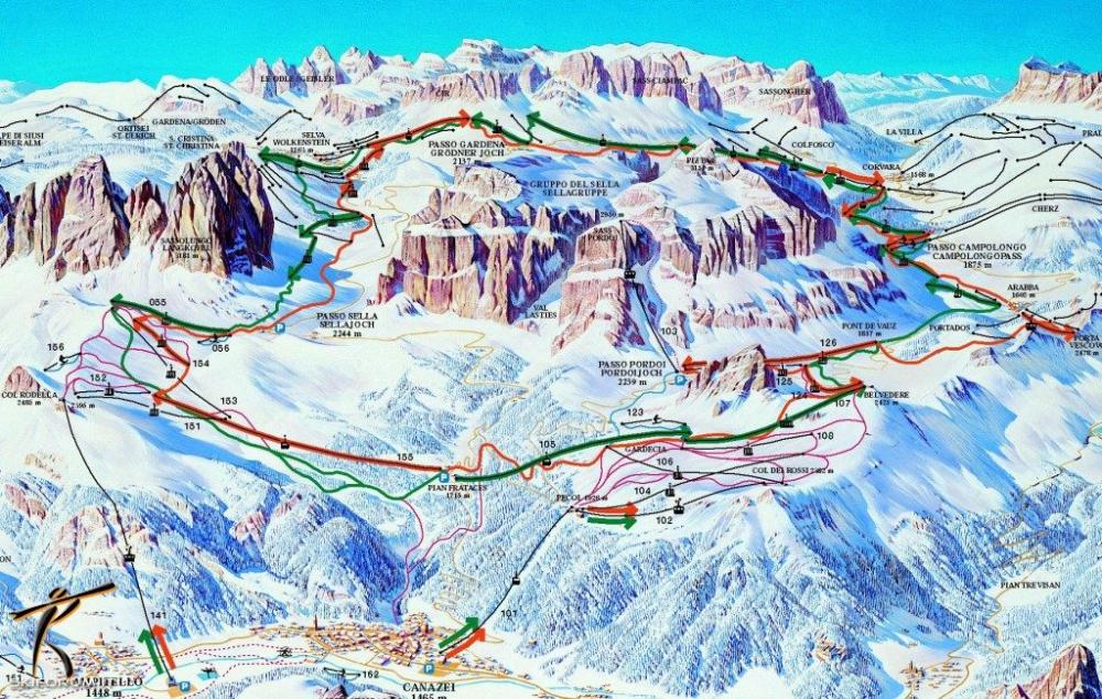 Questo carosello di piste, servite da moderni impianti, è un vero e proprio paradiso per ogni sciatore. L'itinerario può essere affrontato in 5-6 ore anche da sciatori meno esperti, semplicemente utilizzando lo skipass Dolomiti Superski.